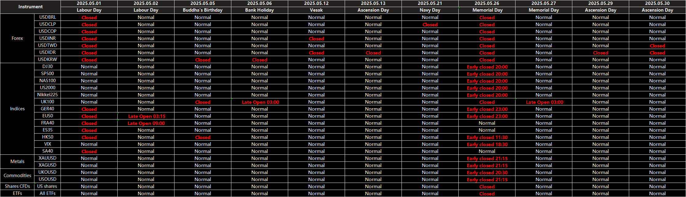 Please be advised that the following instruments’ trading hours and market session times will be affected by the May holidays.